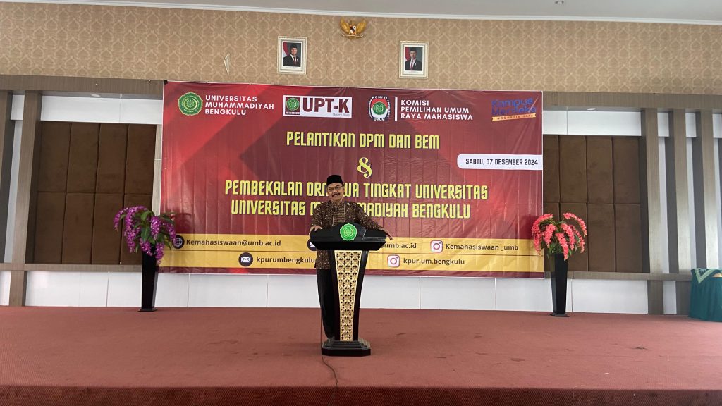 Wakil Rektor III UM Bengkulu melantik Pengurus Dewan Perwakilan Mahaasiswa (DPM) dan Badan Eksekutif Mahasiswa (BEM) UM Bengkulu Periode 2024-2025 dan penyerahan SK Unit Kegiatan Mahasiswa (UKM) UM Bengkulu Periode 2024-2025 kepada Pengurus UKM Tapak Suci, UKM Paduan Suara, UKM Duta Kampus, UKM PIK-M, sekaligus membuka kegiatan Pembekalan Ormawa Tingkat Universitas Muhammadiyah Bengkulu secara resmi pada Sabtu, 07 November 2024 di Aula Hasan Dien UM Bengkulu.Turut hadir Kepala UPT Kemahasiswaan UM Bengkulu, Wakil Dekan III selingkup UM Bengkulu, pengurus BEM selingkup Kota Bengkulu.
