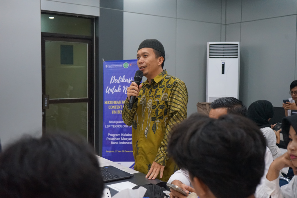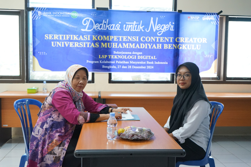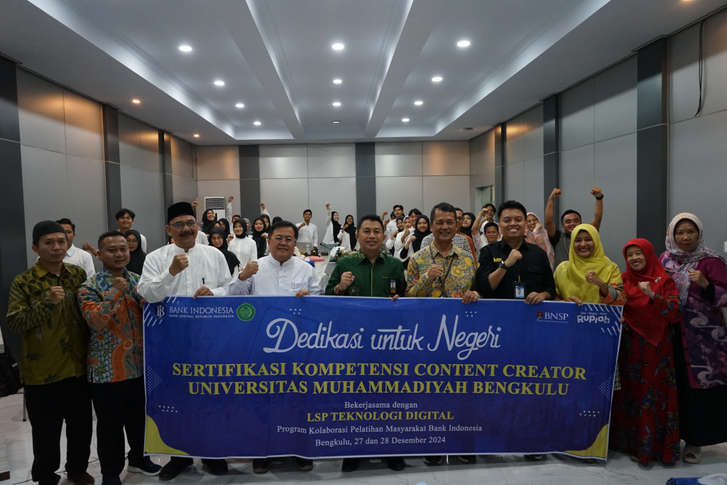 Universitas Muhammadiyah Bengkulu melaksanakan kegiatan Sertifikasi Kompetensi Content Creator pada 28 Desember 2024 di Ruang Rapat Rektorat, Kampus 1 UM Bengkulu. Kegiatan ini bekerja sama dengan Bank Indonesia dalam Program Kolaborasi Pelatihan Masyarakat, pelaksana kegiatan UPT Kemahasiswaan UM Bengkulu dan Lembaga Penelitian dan Pengabdian Kepada Masyarakat (LPPM) menggandeng Lembaga Sertifikasi Profesi (LSP) Teknologi Digital.