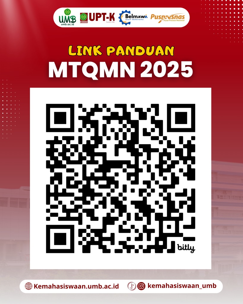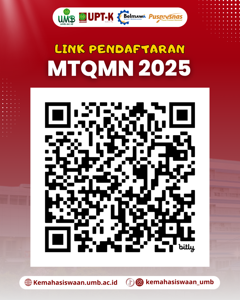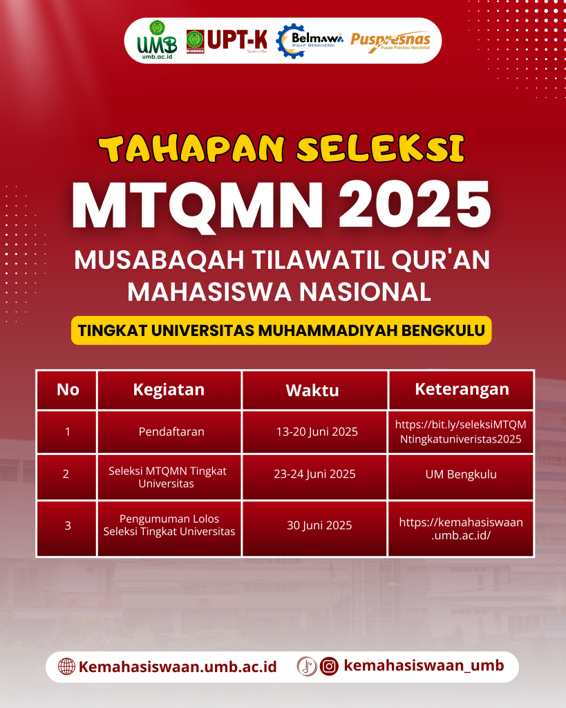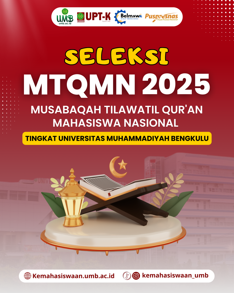 Sehubungan dengan akan diadakan kompetisi Musabaqah Tilawatil Qur’an Mahasiswa Nasional (MTQMN) Tahun 2025 yang melibatkan mahasiswa sebagai pesertanya, maka kami UPT Kemahasiswaan memanggil para mahasiswa aktif UM Bengkulu untuk dilakukan seleksi peserta MTQMN). Setiap Peserta hanya diperbolehkan mengikuti 1 cabang lomba di MTQMN.