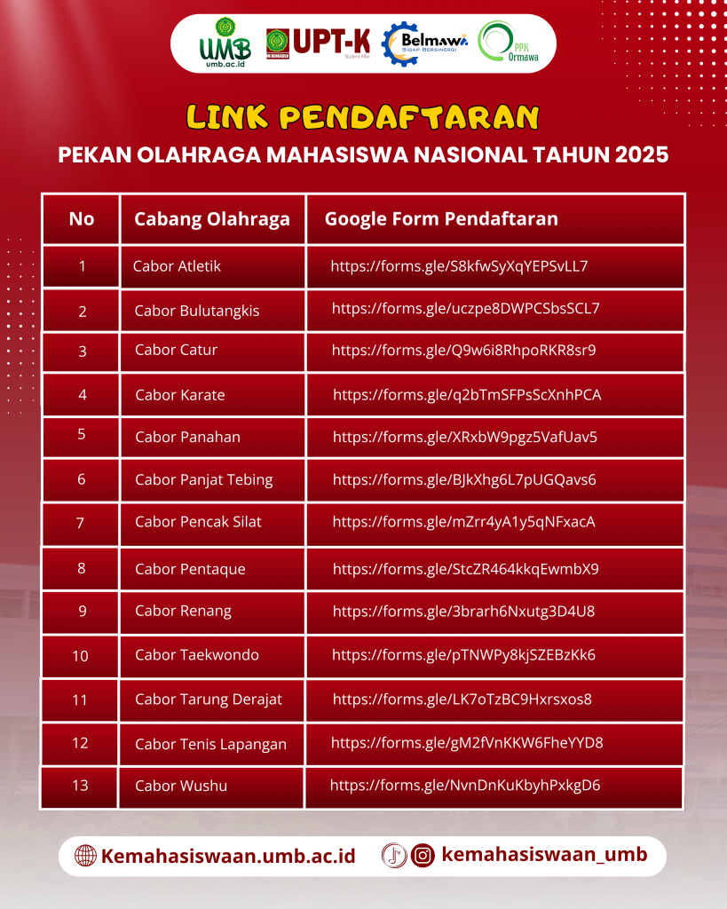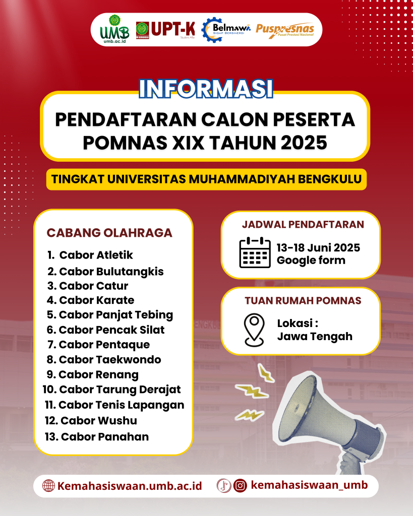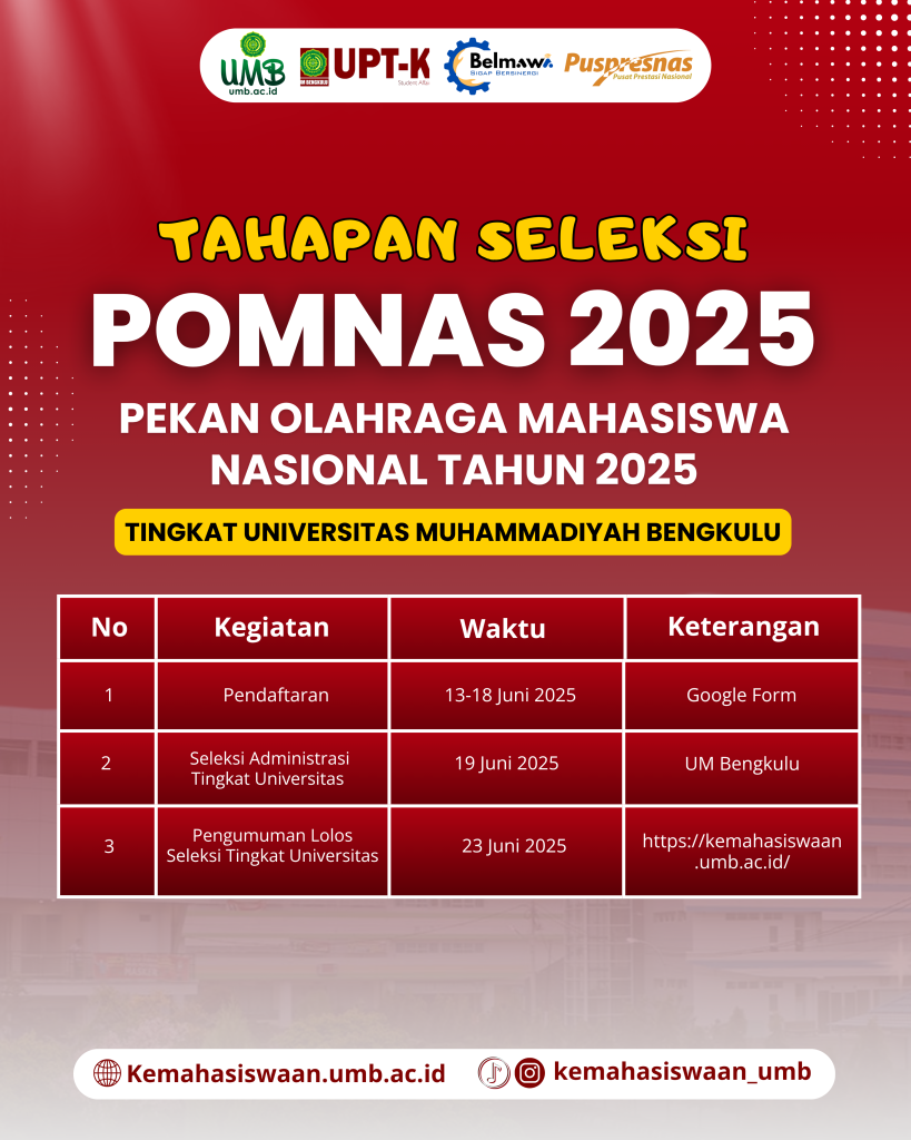 Sehubungan dengan akan diadakan Pekan Olahragan Mahasiswa Nasional Tahun 2025 yang diselenggarakan di Jawa Tengah, maka dalam hal ini kami UPT Kemahasiswaan mengajak mahasiswa aktif UM Bengkulu yang memiliki potensi pada cabang olahraga POMNAS untuk dapat mengikuti seleksi atlet POMNAS Tahun 2025 Tingkat Universitas. Setiap mahasiswa hanya bisa mengikuti satu cabang olahraga yang diseleksikan.