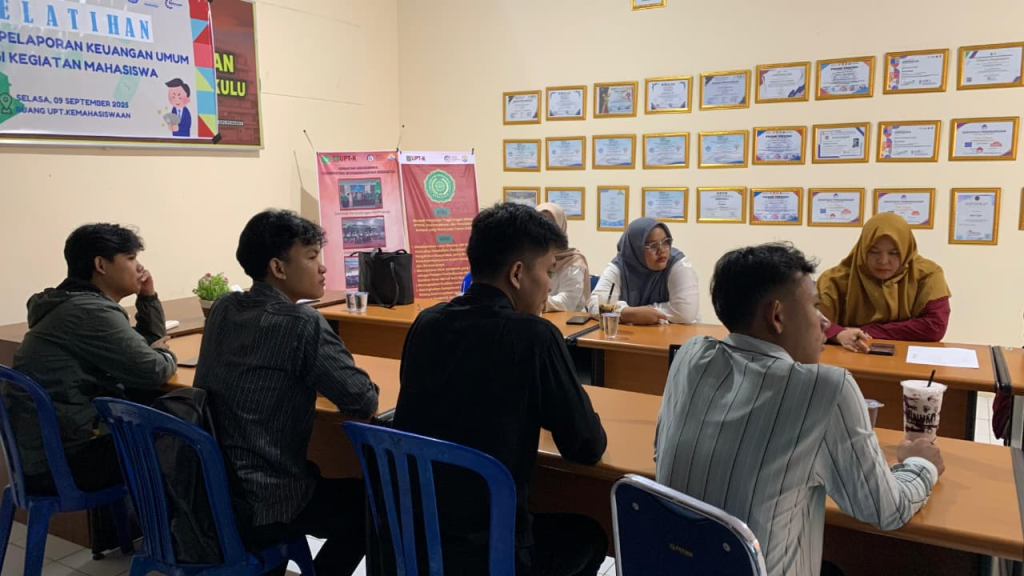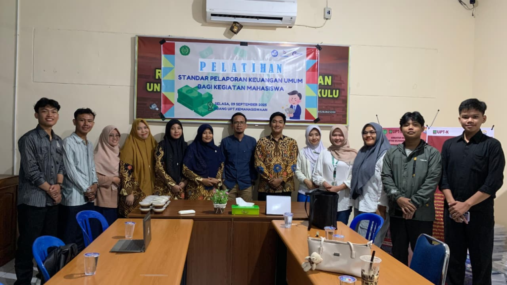 Dalam rangka meningkat kapasitas mahasiswa dalam administrasi organisasi maka diperlukannya pelatihan dalam penyusunan laporan keuangan kegiatan pada 09 September 2025. Setiap diakhir kegiatan aka nada proses pelaporan tersebut yang menjadi kendala tersendiri mahasiswa dalam menyelesaikan laporan kegiatan dalam organisasi, Mahasiswa Kuliah Kerja Nyata Reguler II UM Bengkulu melakukan pelatihan penyusunan Laporan Keuangan Kegaitan di Ruang Rapat UPT Kemahasiswaan kepada pengurus organisasi mahasiswa yang ada di UM Bengkulu, ada perwakilan dari Himpunan Mahasiswa (HIMA), Badan Eksekutif Mahasiswa Tingkat Universitas (BEM-U) Badan Eksekutif Mahasiswa Tingkat Fakultas (BEM-F), Unit Kegiatan Mahasiswa (UKM).